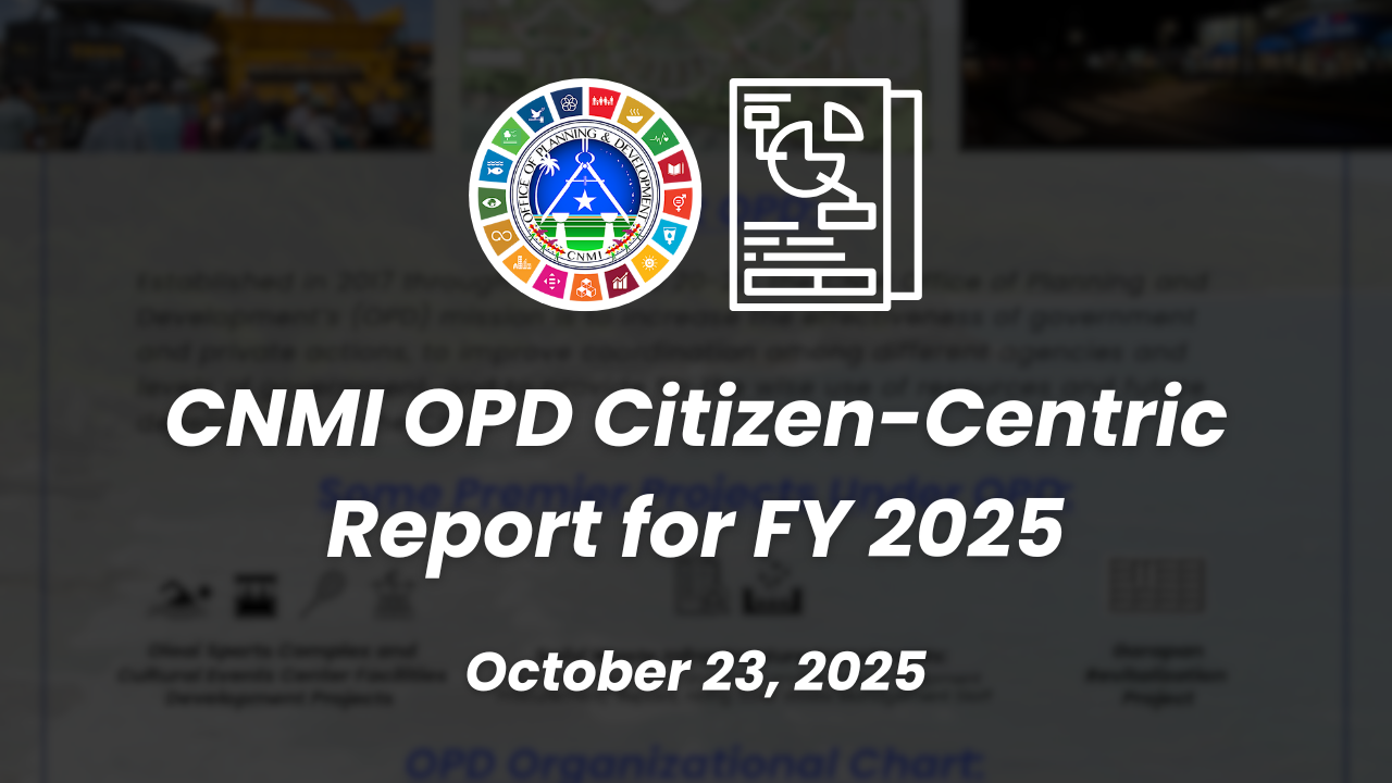 In accordance with Public Law 20-83, the CNMI Office of Planning and Development (OPD) prepared this Citizen-Centric Report (CCR) to report on ongoing projects, the current state of OPD's finances, and challenges and next steps going into FY 2026....